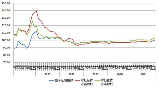 分車型指數(shù)看,各車型指數(shù)環(huán)比小幅回升,且繼續(xù)優(yōu)于去年同期。以大宗商品及區(qū)域運(yùn)輸為主的整車指數(shù)為103點,比上月回升0.98%,比上年同期增長3.6%。零擔(dān)指數(shù)中,零擔(dān)輕貨指數(shù)為100.3點,比上月回升1.01%,比上年同期增長3.2%;零擔(dān)重貨指數(shù)為102.8點,比上月回升0.98%,比上年同期增長3.7%。