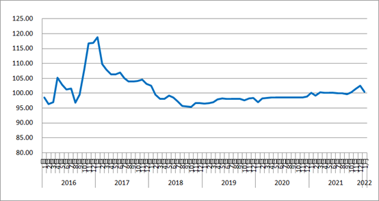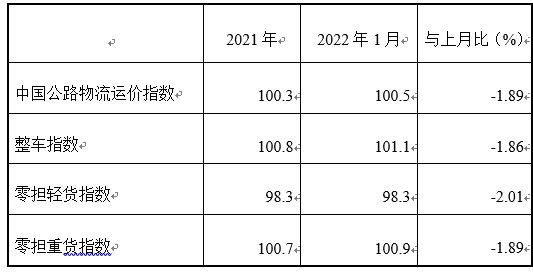 2022年1月份,由中國物流與采購聯合會和林安物流集團聯合調查的中國公路物流運價指數為100.5點,比上月回落1.89%,比去年同期增長0.4%。從各周指數看,第一、二、四周運價指數環比回升,第三周運價指數環比回落。