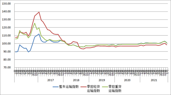 分車型指數看,各車型指數環比小幅回落,同比保持小幅增長但幅度有所收窄。以大宗商品及區域運輸為主的整車指數為101.1點,比上月回落1.86%,比上年同期增長0.5%。零擔指數中,零擔輕貨指數為98.3點,比上月回落2.01%,比上年同期增長0.1%;零擔重貨指數為100.9點,比上月回落1.89%,比上年同期增長0.5%。