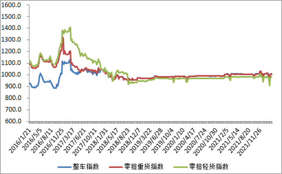 分車型看,各車型指數(shù)環(huán)比漲跌互現(xiàn)。其中,整車指數(shù)為1008.40點(diǎn),比上周回升0.01%;零擔(dān)輕貨指數(shù)為983.65點(diǎn),與上周基本持平;零擔(dān)重貨指數(shù)為1006.16點(diǎn),比上周回落0.11%。