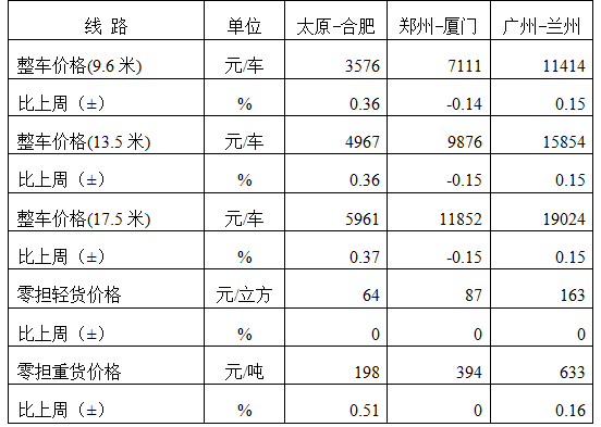 分車(chē)型看,各車(chē)型指數(shù)環(huán)比總體平穩(wěn)。其中,整車(chē)指數(shù)為1008.32點(diǎn),與上周基本持平;零擔(dān)輕貨指數(shù)為983.67點(diǎn),與上周基本持平;零擔(dān)重貨指數(shù)為1006.19點(diǎn),與上周基本持平。