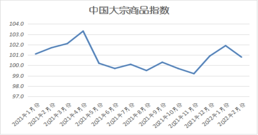 由中國物流與采購聯合會調查、發布的2022年2月份中國大宗商品指數(CBMI)為100.8%,較上月回落1.1個百分點。各分項指數中,供應指數和銷售指數均有所回落,庫存指數則持續上升。從本月指數的變化情況來看,國內大宗商品市場受春節因素影響較為明顯,終端需求基本停滯,供需失衡的格局繼續顯現,商品庫存仍在積壓,市場運行壓力較大。進入3月份以后,下游需求將迎來復蘇,市場供需矛盾有望得到緩解,進而支撐價格上漲。不過面對生產企業產能持續釋放以及庫存高企等因素,供給端壓力也較為明顯,特別是近期油價持續上漲,將會給生產和流通企業帶來成本壓力,價格上行或存在一定的阻礙。