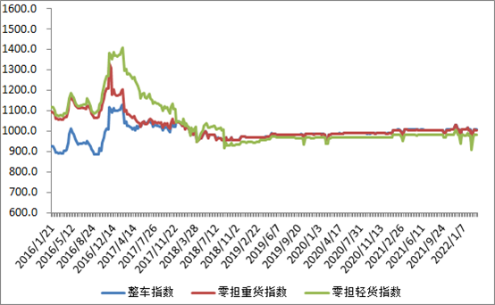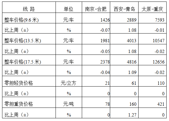 分車型看,各車型指數(shù)環(huán)比漲跌互現(xiàn)。其中,整車指數(shù)為1008.09點(diǎn),比上周回落0.02%;零擔(dān)輕貨指數(shù)為983.65點(diǎn),與上周基本持平;零擔(dān)重貨指數(shù)為1007.04點(diǎn),比上周回升0.08%。