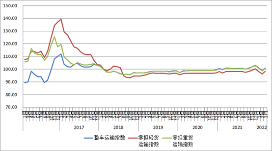 分車型指數看,各車型指數環比上月小幅回升,與去年同期基本持平。以大宗商品及區域運輸為主的整車指數為100.8點,比上月回升1.98%,比上年同期增長0.03%。零擔指數中,零擔輕貨指數為98.4點,比上月回升2.30%,比上年同期增長0.22%;零擔重貨指數為100.6點,比上月回升1.93%,與上年同期持平。