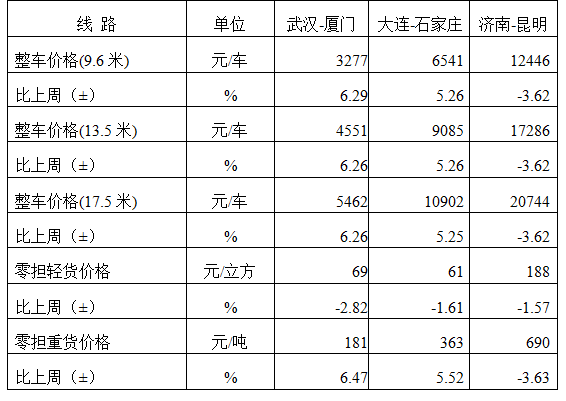 分車型看,各車型指數有不同程度回升。其中,整車指數為1017.51點,比上周回升0.03%;零擔輕貨指數為1003.13點,比上周回升1.68%;零擔重貨指數為1016.98點,比上周回升0.10%。