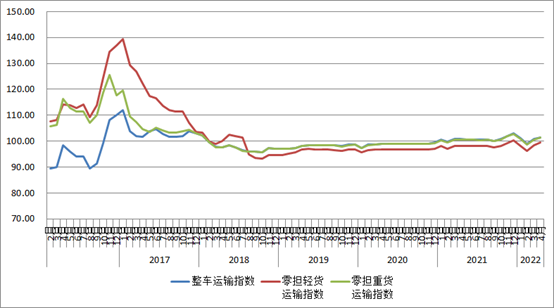 2022年4月份,由中國物流與采購聯合會和林安物流集團聯合調查的中國公路物流運價指數為101點,比上月回升0.71%,比去年同期增長0.84%。從周指數看,第二、五周運價指數回落,第一、三、四周運價指數環比回升。