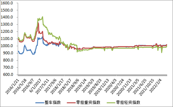 分車型看,各車型指數(shù)環(huán)比有所回升。其中,整車指數(shù)為1028.35點(diǎn),比上周回升1.33%;零擔(dān)輕貨指數(shù)為1020.40點(diǎn),比上周回升1.22%;零擔(dān)重貨指數(shù)為1027.97點(diǎn),比上周回升1.29%。