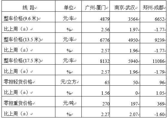 分車型看,各車型指數環比均有回升。其中,整車指數為1026.57點,比上周回升1.24%;零擔輕貨指數為1020.46點,比上周回升1.19%;零擔重貨指數為1026.31點,比上周回升1.21%。