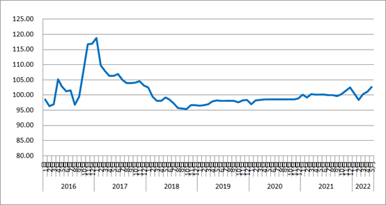 2022年5月份,由中國物流與采購聯(lián)合會和林安物流集團(tuán)聯(lián)合調(diào)查的中國公路物流運(yùn)價(jià)指數(shù)為102.6點(diǎn),比上月回升1.57%,比去年同期增長2.43%。從周指數(shù)看,第一、二、四周運(yùn)價(jià)指數(shù)有所回升,第三周運(yùn)價(jià)指數(shù)有所回落。