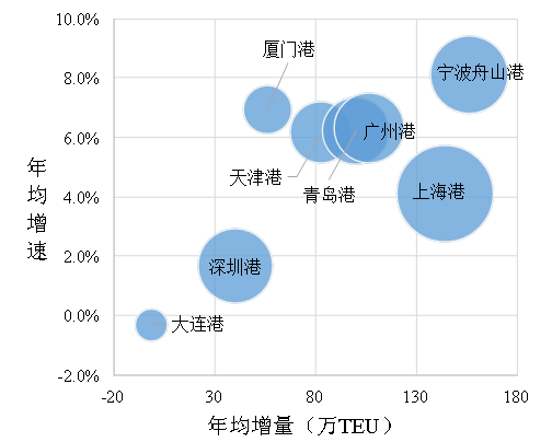 從集裝箱運輸的重點港口看,我國沿海大連港、天津港、青島港、上海港、寧波舟山港、廈門港、廣州港、深圳港八大集裝箱干線港共完成集裝箱吞吐量1.79億TEU,占沿海港口集裝箱總吞吐量的72.2%。2010年以來,八大干線港年均增長4.9%。其中,大連港腹地受中美貿易摩擦和疫情等沖擊明顯,近幾年吞吐量連續下滑,年均下降0.3%;天津港、青島港保持良好勢頭,增速達到6.2%;上海港依托長江經濟帶強勁的貨源需求,保持了年均4.1%的增長;寧波舟山港積極拓展腹地、發展多式聯運,年均增速高達8.1%,增幅居八港首位;廈門港在內支線和內貿航線帶動下,增速達到7.0%;深圳港國際航線表現疲軟,但內支線和內貿航線成為新增長點,實現年均增長1.7%;廣州港水水轉運發展迅猛,帶動全港實現年均增長6.3%。見圖2。