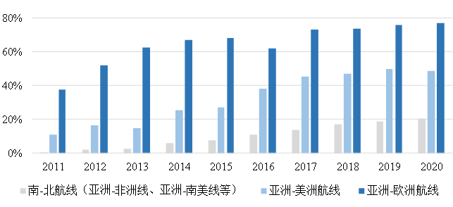 圖4 2011—2020年主要航線8000TEU以上(10萬噸級以上)船舶占比變化[10]
