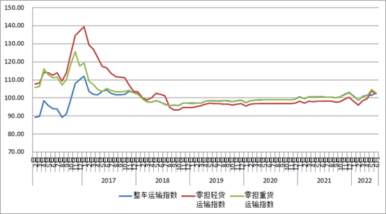 分車型指數看,各車型指數漲跌互現,相較去年同期均呈現增長態勢。以大宗商品及區域運輸為主的整車指數為102.8點,比上月回升1.4%,比上年同期增長2.22%。零擔指數中,零擔輕貨指數為102.3點,比上月回落1.68%,比上年同期增長4.23%;零擔重貨指數為102.8點,比上月回落1.88%,比上年同期增長2.25%。