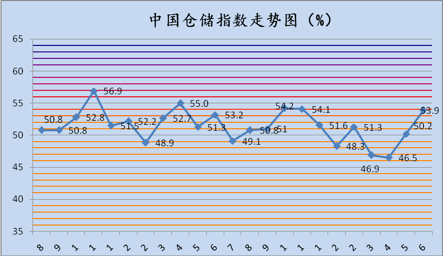 周轉效率明顯提高。6月份,平均庫存周轉次數指數為55.8%,較上月回升8.4個百分點至榮枯線以上,結束之前半年的下行態勢,重回擴張區間。反映出前期受疫情影響出現的交通受阻問題基本解決,物流保通保暢成效顯現,加之市場供需明顯恢復,倉儲貨物周轉效率明顯提高。分品種來看,鋼材、有色、化工、建材、木材、食品、服裝、紡織品、棉麻等商品周轉效率較上月回升幅度較大。