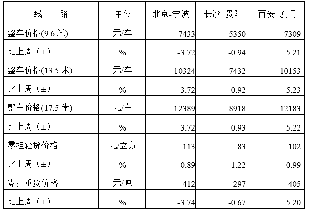 分車型看,各車型指數環比均小幅回升。其中,整車指數為1026.59點,比上周回落1.20%;零擔輕貨指數為1019.68點,比上周回落1.28%;零擔重貨指數為1026.29點,比上周回落1.20%。