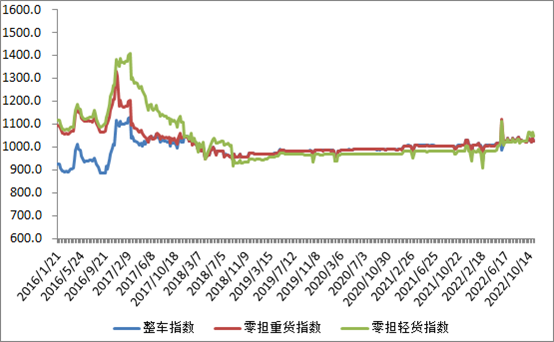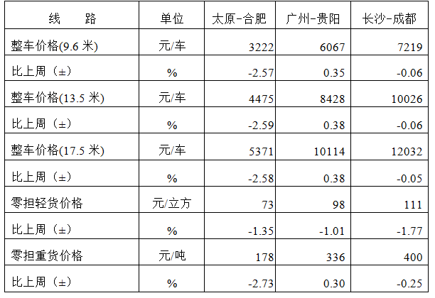 分車型看,各車型指數環比有所回落。其中,整車指數為1025.36點,比上周回落1.32%;零擔輕貨指數為1049.34點,比上周回落1.31%;零擔重貨指數為1024.29點,比上周回落1.38%。