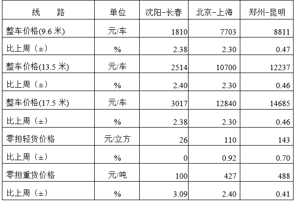 分車型看,各車型指數環比小幅回升。其中,整車指數為1040.78點,比上周回升1.47%;零擔輕貨指數為1062.68點,比上周回升1.30%;零擔重貨指數為1039.60點,比上周回升1.48%。