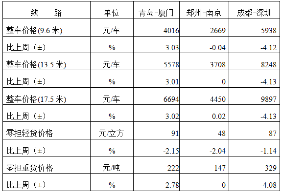 分車型看,各車型指數環比小幅回落。其中,整車指數為1026.05點,比上周回落1.42%;零擔輕貨指數為1049.12點,比上周回落1.28%;零擔重貨指數為1024.85點,比上周回落1.42%。