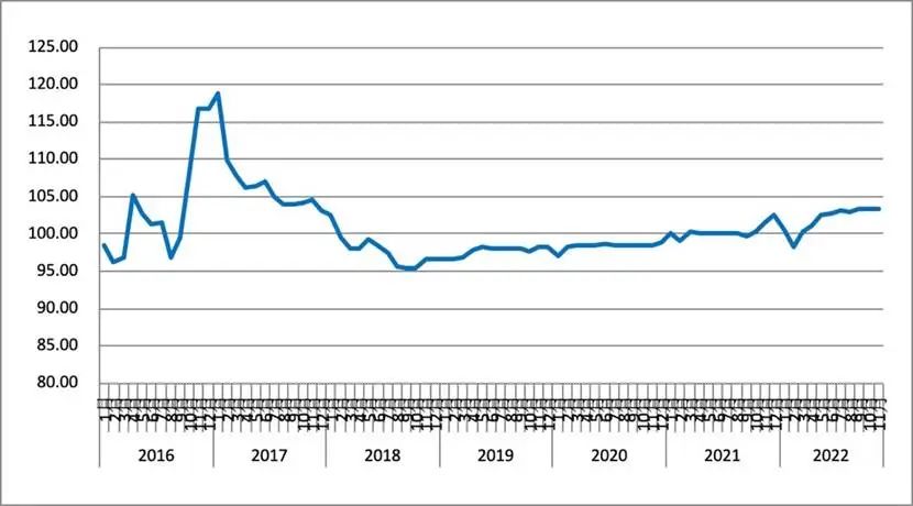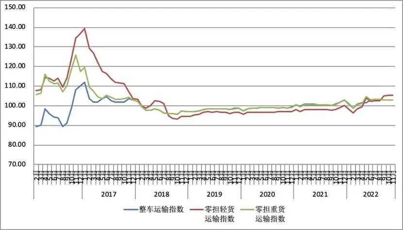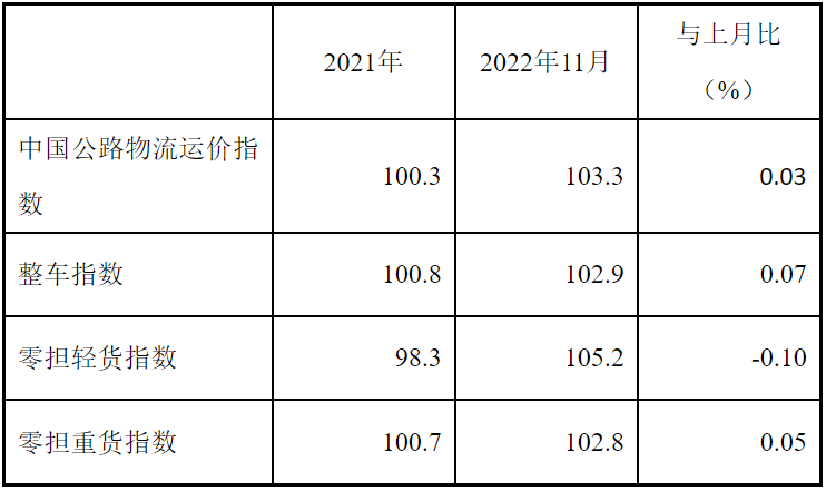 2022年11月份,由中國物流與采購聯合會和林安物流集團聯合調查的中國公路物流運價指數為103.3點,比上月回升0.03%,比去年同期增長1.8%。從周指數看,第一、三周運價指數環比回升,第二、四周運價指數環比回落。