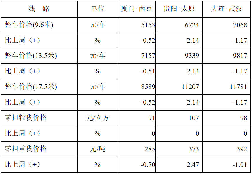 分車型看,各車型指數環比漲跌互現。其中,整車指數為1026.58點,比上周回升0.04%;零擔輕貨指數為1048.94點,比上周回落0.03%;零擔重貨指數為1026.55點,比上周回升0.15%。