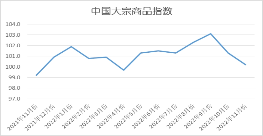由中國物流與采購聯(lián)合會(huì)調(diào)查、發(fā)布的2022年11月份中國大宗商品指數(shù)(CBMI)為100.2%,較上月下跌1.1個(gè)百分點(diǎn),指數(shù)連續(xù)兩個(gè)月下跌,跌至近七個(gè)月以來的最低點(diǎn)。各分項(xiàng)指數(shù)中,供應(yīng)指數(shù)、銷售指數(shù)雙雙繼續(xù)下跌,庫存指數(shù)則持續(xù)上升。從指數(shù)的變化情況來看,11月份國內(nèi)大宗商品市場供需兩端均明顯放緩,市場供大于求的跡象進(jìn)一步凸顯,商品庫存出現(xiàn)積壓,市場淡季特征開始顯現(xiàn)。與我們上月的預(yù)判“淡季強(qiáng)度繼續(xù)減弱,市場運(yùn)行壓力加大”相符。進(jìn)入12月份,政策推動(dòng)經(jīng)濟(jì)平穩(wěn)向好,但疫情管控對(duì)局部仍有負(fù)面影響,市場預(yù)期仍顯悲觀。隨著氣溫快速降低,下游施工將受到限制,特別是北方地區(qū)停工范圍還會(huì)擴(kuò)大,需求放緩的速度將會(huì)加快,市場供需矛盾將會(huì)加劇,庫存壓力將會(huì)持續(xù)加大,商品價(jià)格整體仍將回落。