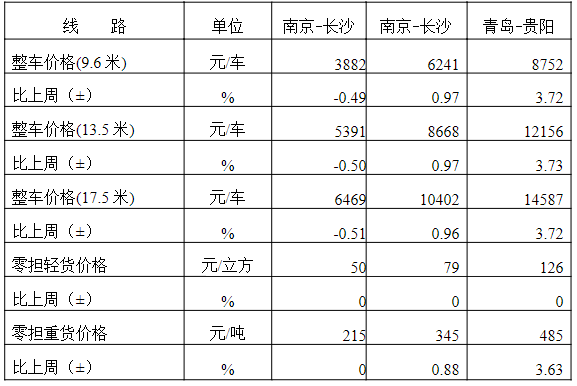 分車型看,各車型指數環比漲跌互現。其中,整車指數為1026.27點,比上周回落0.04%;零擔輕貨指數為1048.72點,比上周回落0.01%;零擔重貨指數為1025.02點,比上周回落0.04%。