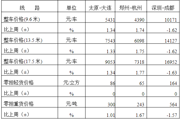 分車型看,各車型指數環比漲跌互現。其中,整車指數為1026.73點,比上周回升0.04%;零擔輕貨指數為1048.59點,比上周回落0.01%;零擔重貨指數為1025.57點,比上周回升0.05%。