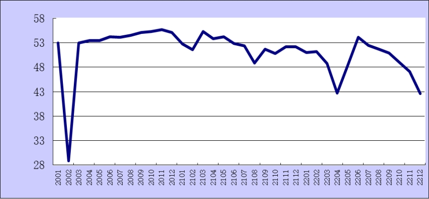 中國物流與采購聯合會、國家統計局服務業調查中心采購經理調查發布的2022年12月份綜合PMI產出指數為42.6%,較上月下降4.5個百分點。該指數是PMI指標體系中反映當期全行業(制造業和非制造業)產出變化情況的綜合指數,由制造業生產指數與非制造業商務活動指數加權求和而成,權數分別為制造業和非制造業占GDP的比重。