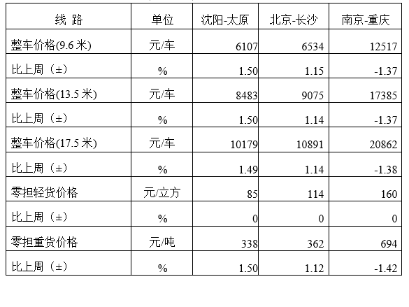 分車型看,各車型指數(shù)環(huán)比漲跌互相。其中,整車指數(shù)為1027.99點(diǎn),比上周回升0.04%;零擔(dān)輕貨指數(shù)為1048.21點(diǎn),比上周回落0.02%;零擔(dān)重貨指數(shù)為1026.65點(diǎn),比上周回升0.04%。
