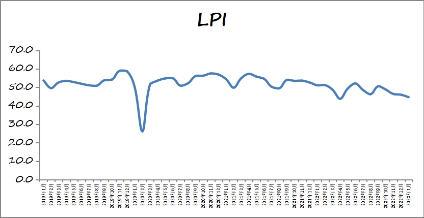 中國物流與采購聯合會發布的2023年1月份中國物流業景氣指數為44.7%,較上月回落1.3個百分點。業務總量指數、商品庫存周轉指數、設備利用率指數和固定投資指數有所回落,新訂單指數和業務活動預期指數明顯上升。