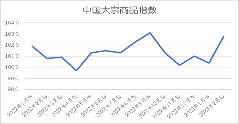 由中國物流與采購聯合會調查、發布的2023年2月份中國大宗商品指數(CBMI)為102.8%,升至近五個月以來的最高,較上月回升2.4個百分點,表明國內大宗商品市場運行形勢開始回暖,行業經營狀況有所好轉,基本符合我們上月“大宗商品市場正在轉向強勢格局轉化”的判斷。各分項指數中,供應指數和銷售指數止均止跌回升,庫存指數自高點回落。從指數的變化情況來看,當前國內大宗商品市場需求開始恢復,行業預期持續向好,終端行業采購、生產等經營活動積極,市場庫存壓力有所減緩。不過值得注意的是,銷售指數的回升力度略低于供應指數,綜合指數繼續上升則主要還是因為受到供應端的拉動更大,銷售端對市場支持力度偏小,市場供需仍存在一定的失衡狀態。縱觀后市,雖供應端壓力依然存在,但隨著需求的進一步發力以及宏觀經濟環境持續好轉,我們認為國內大宗商品市場持續回暖的基礎良好,市場運行將會繼續向好。