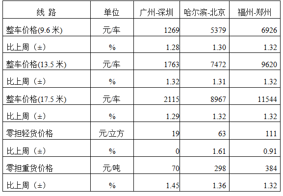 分車型看,各車型指數(shù)環(huán)比較快回升。其中,整車指數(shù)為1040.21點(diǎn),比上周回升1.32%;零擔(dān)輕貨指數(shù)為1033.58點(diǎn),比上周回升1.30%;零擔(dān)重貨指數(shù)為1039.95點(diǎn),比上周回升1.31%。