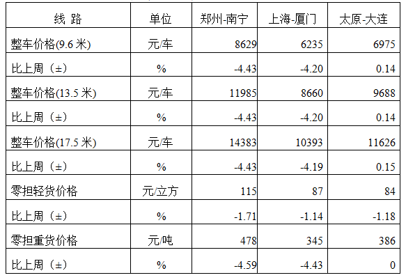 分車型看,各車型指數(shù)環(huán)比有所回落。其中,整車指數(shù)為1026.90點(diǎn),比上周回落1.28%;零擔(dān)輕貨指數(shù)為1020.26點(diǎn),比上周回落1.29%;零擔(dān)重貨指數(shù)為1026.56點(diǎn),比上周回落1.29%。