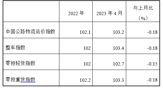 2023年4月份,由中國物流與采購聯(lián)合會和林安物流集團(tuán)聯(lián)合調(diào)查的中國公路物流運價指數(shù)為103.2點,比上月回落0.18%,比去年同期增長2.18%。從周指數(shù)看,第一、三周運價指數(shù)環(huán)比回落,第二、四周運價指數(shù)環(huán)比回升。