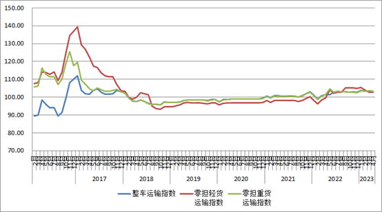 分車型指數(shù)看,各車型指數(shù)環(huán)比有所回落,同比去年小幅增長。以大宗商品及區(qū)域運輸為主的整車指數(shù)為103.4點,比上月回落0.18%,比上年同期增長1.91%。零擔(dān)指數(shù)中,零擔(dān)輕貨指數(shù)為102.7點,比上月回落0.15%,比上年同期增長3.26%;零擔(dān)重貨指數(shù)為103.3點,比上月回落0.18%,比上年同期增長1.96%。