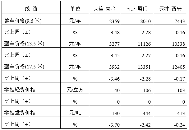 分車型看,各車型指數環比有所回落。其中,整車指數為1024.66點,比上周回落0.23%;零擔輕貨指數為1020.67點,比上周回落0.02%;零擔重貨指數為1024.34點,比上周回落0.35%。