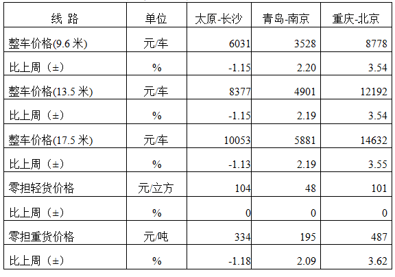 分車型看,各車型指數環比略微回升。其中,整車指數為1027.02點,比上周回升0.09%;零擔輕貨指數為1020.17點,比上周回升0.01%;零擔重貨指數為1026.09點,比上周回升0.09%。