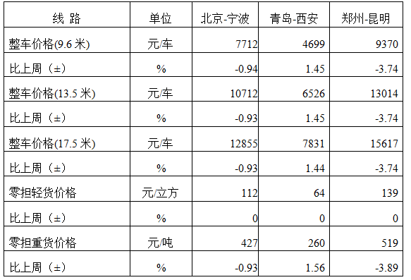 分車型看,各車型指數環比有所回落。其中,整車指數為1026.24點,比上周回落0.08%;零擔輕貨指數為1020.20點,比上周回落0.03%;零擔重貨指數為1025.39點,比上周回落0.08%。