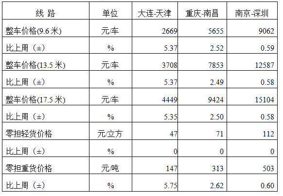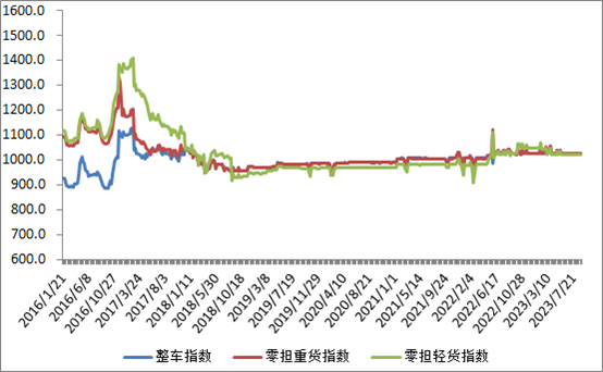 分車型看,各車型指數環比有所回升。其中,整車指數為1027.2點,比上周回升0.09%;零擔輕貨指數為1020.21點,與上周基本持平;零擔重貨指數為1026.23點,比上周回升0.08%。