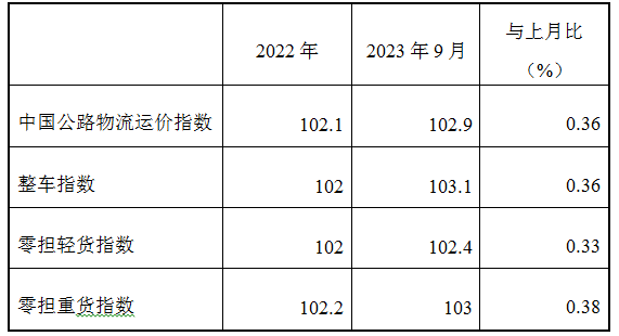 2023年9月份,由中國物流與采購聯(lián)合會和林安物流集團聯(lián)合調(diào)查的中國公路物流運價指數(shù)為102.9點,比上月回升0.36%,比去年同期下降0.5%。從周指數(shù)看,第二、四、五周運價指數(shù)環(huán)比回升,第一、三周運價指數(shù)環(huán)比回落。