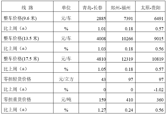 分車型看,各車型指數環比較快回升。其中,整車指數為1039.44點,比上周回升1.28%;零擔輕貨指數為1033.56點,比上周回升1.32%;零擔重貨指數為1038.54點,比上周回升1.28%。