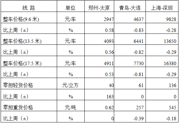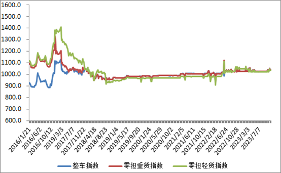 分車型看,各車型指數環比略微回落。其中,整車指數為1038.71點,比上周回落0.04%;零擔輕貨指數為1033.58點,比上周回落0.01%;零擔重貨指數為1037.70點,比上周回落0.03%。