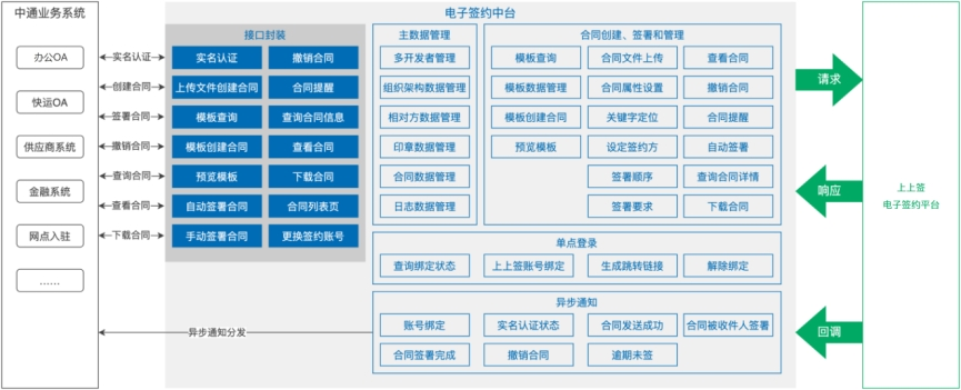 中通無需關(guān)注電子簽約底層邏輯,電子簽約底層邏輯及合規(guī)性由上上簽電子簽約保障。電子簽約中臺系統(tǒng)封裝如下: