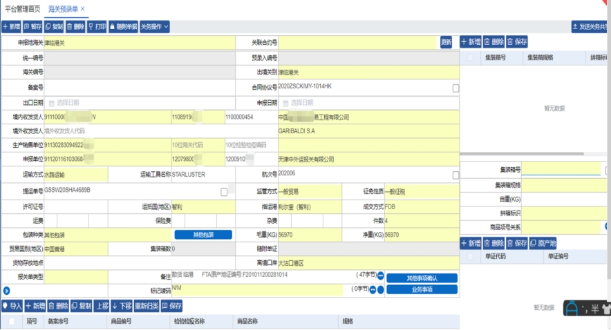 支持海關(guān)預(yù)錄信息導(dǎo)入,開放客戶權(quán)限,前置錄入報關(guān)相關(guān)信息的同時,還可以利用OCR識別技術(shù)上傳電子版報關(guān)信息,系統(tǒng)自動識別和抓取業(yè)務(wù)數(shù)據(jù),一鍵生成海關(guān)預(yù)錄單,通過關(guān)務(wù)共享中心,對接單一窗口,實現(xiàn)客戶端與海關(guān)無縫連接,從而提高各個環(huán)節(jié)的操作效率。