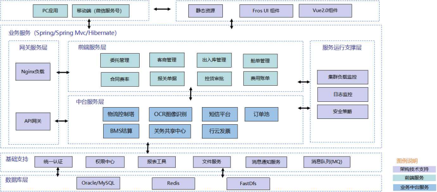 大宗散雜貨出口管理系統(tǒng)采用外運股份FROS微服務(wù)框架前后端分離技術(shù),支持多種前端框架,后端服務(wù)主要包括網(wǎng)關(guān)服務(wù)層、前端服務(wù)層、中臺服務(wù)層、服務(wù)運行支撐層,并通過第三方服務(wù)提供基礎(chǔ)服務(wù)支持。其中后端服務(wù)采用MVC架構(gòu)模式,作為常用的敏捷開發(fā)框架之一,簡化了應(yīng)用程序開發(fā)的分層復(fù)雜度,具備高可用性、高可維護性、高伸縮性等特點。