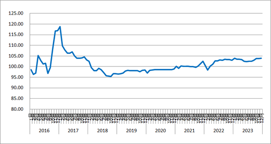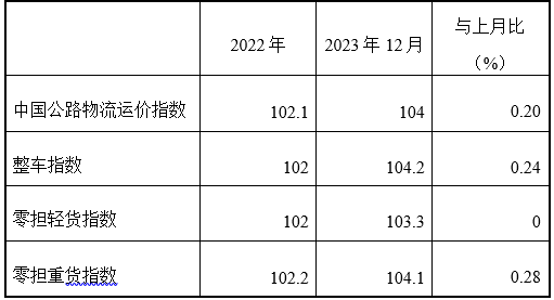 2023年12月份,由中國物流與采購聯合會和林安物流集團聯合調查的中國公路物流運價指數為104點,比上月回升0.2%,比去年同期回升0.9%。從周指數看,第一、四周運價指數環比回落,第二、三、五周運價指數環比回升。