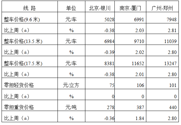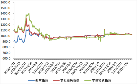 分車型看,各車型指數環比略有回升。其中,整車指數為1026.41點,比上周回升0.07%;零擔輕貨指數為1020.75點,與上周基本持平;零擔重貨指數為1025.11點,比上周回升0.07%。