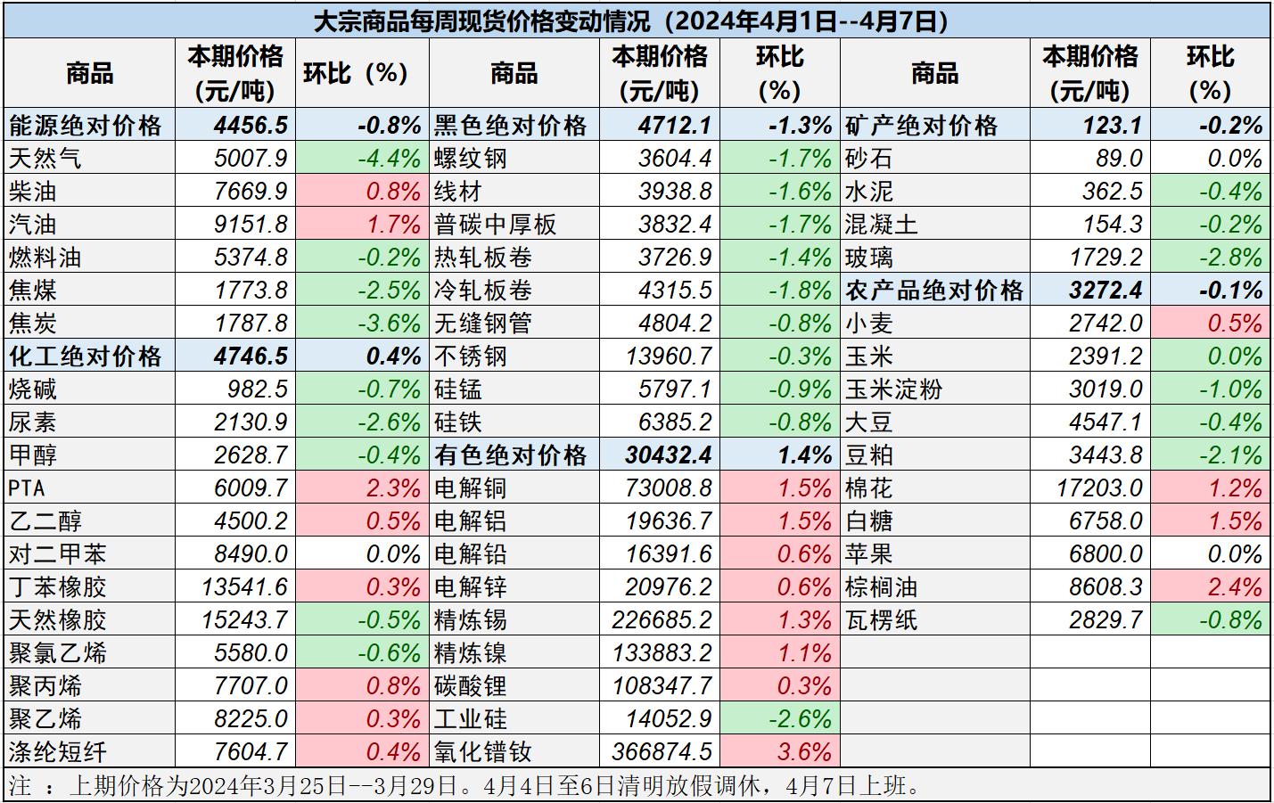 本表所示大宗商品價(jià)格(類別與產(chǎn)品規(guī)格說明見附表)為以人民幣計(jì)價(jià)的現(xiàn)貨價(jià)格(包含流通費(fèi)用、利潤和稅費(fèi)等)。計(jì)算這些價(jià)格時(shí)使用的信息來源,主要包括國內(nèi)重點(diǎn)地區(qū)的生產(chǎn)商、貿(mào)易商及下游消費(fèi)企業(yè)之間的成交、詢報(bào)盤及可成交價(jià)格。價(jià)格單位為人民幣元/噸。