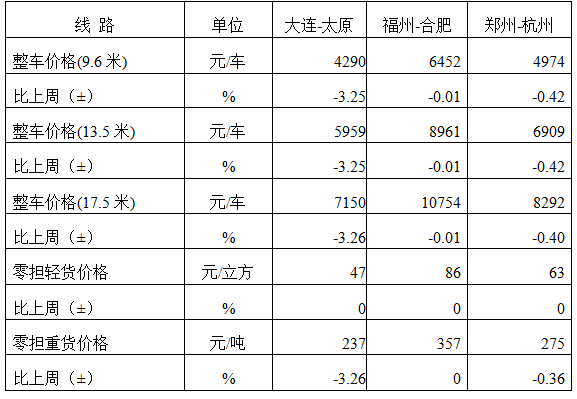 分車型看,各車型指數(shù)環(huán)比略微回落。其中,整車指數(shù)為1025.20點,比上周回落0.01%;零擔輕貨指數(shù)為1020.74點,比上周回落0.01%;零擔重貨指數(shù)為1024.02點,與上周基本持平。