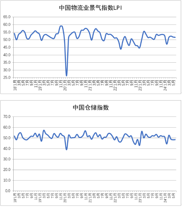 中國物流與采購聯(lián)合會發(fā)布的2024年6月份中國物流業(yè)景氣指數(shù)為51.6%,較上月回落0.2個百分點;中國倉儲指數(shù)為48.5%,較上月回升0.1個百分點。