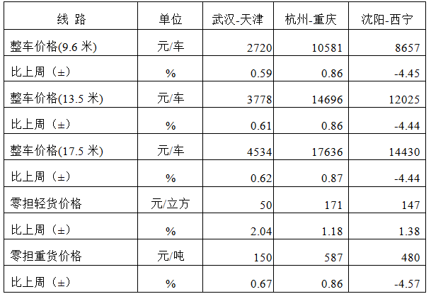 表1 本周部分線路平均價格及環(huán)比情況對比